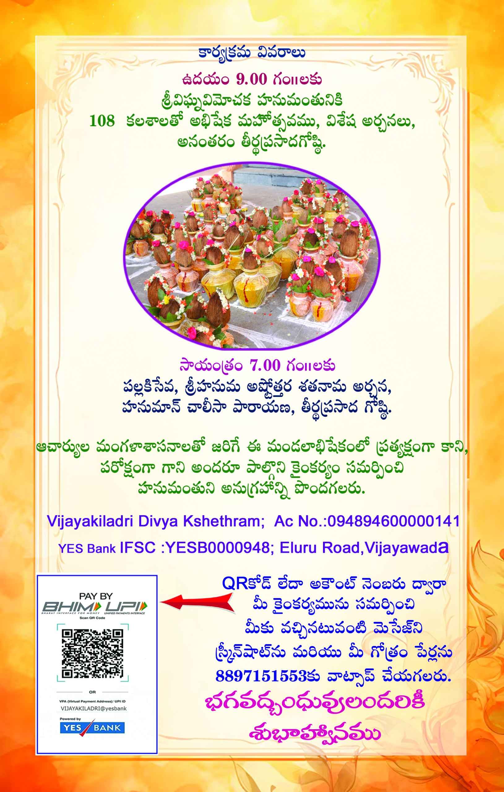 108 కలశాలతో అభిషేక మహోత్సవము, విశేష అర్చనలు, అనంతరం తీర్థప్రసాదగోష్ఠి.